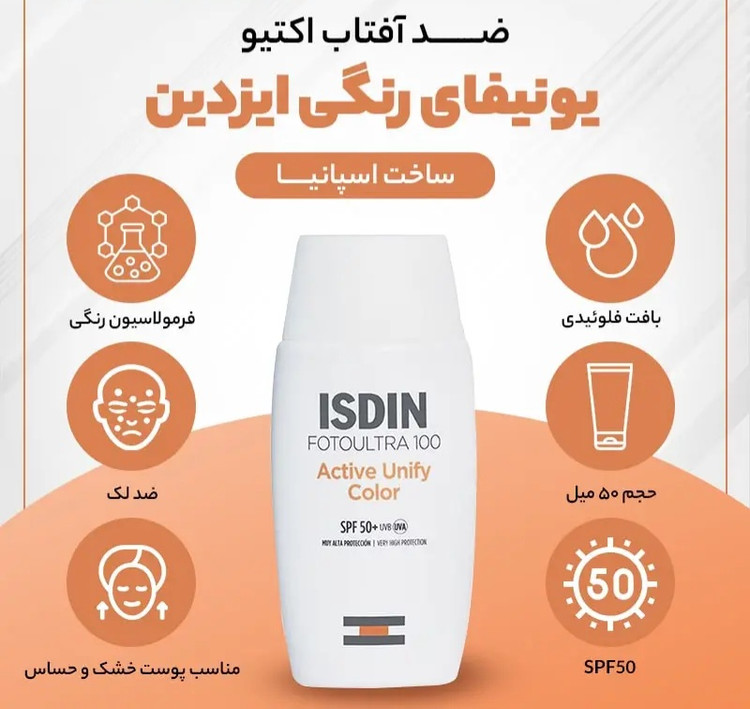 ضد آفتاب و ضد لک رنگی اکتیو یونیفای ایزدین « Fotoultra ISDIN Spot Perevent And Active Unify » یک محصول مراقبتی است که به طور کامل پوست را در برابر اشعههای مضر آفتاب محافظت میکند. این ضد آفتاب، ضد لک بوده و باعث از بین رفتن لکهای پوستی میشود. بعد از مدتی استفاده از این ضد آفتاب پوست بافتی یکدست و شفاف پیدا میکند.