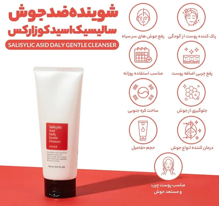 شوینده ضد جوش کوزارکس که حاوی سالیسیلیک اسید است برای استفاده روزانه پوست های جوش دار و مستعد جوش مناسب است. این شوینده صورت از ترکیبات طبیعی که با روغن برگ درخت چای سبز غنی شده است پاک کننده ملایم و موثر برای درمان و پیشگیری از جوش صورت است. شوینده سالیسیلیک اسید کوزارکس آلودگی و ناخالصی و چربی اضافی را به آرامی از بین میبرد و رطوبت پوست را به تعادل میرساند و برای پوست چرب و مستعد جوش مناسب است.